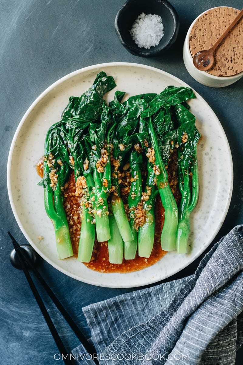 - Bring a large pot of water to a boil. Add a pinch of salt and a drizzle of oil for vibrant color (Optional). Add the Chinese broccoli and boil over medium heat, until the broccoli is cooked through and the stem part remains crisp, 1 to 2 minutes. Drain broccoli, rinse with cold tap water for a few seconds to stop cooking, then drain again and transfer to a large plate. Spread them out so there’s little overlap. If the Chinese broccoli is very wet, you can use paper towels to pat the surface dry.