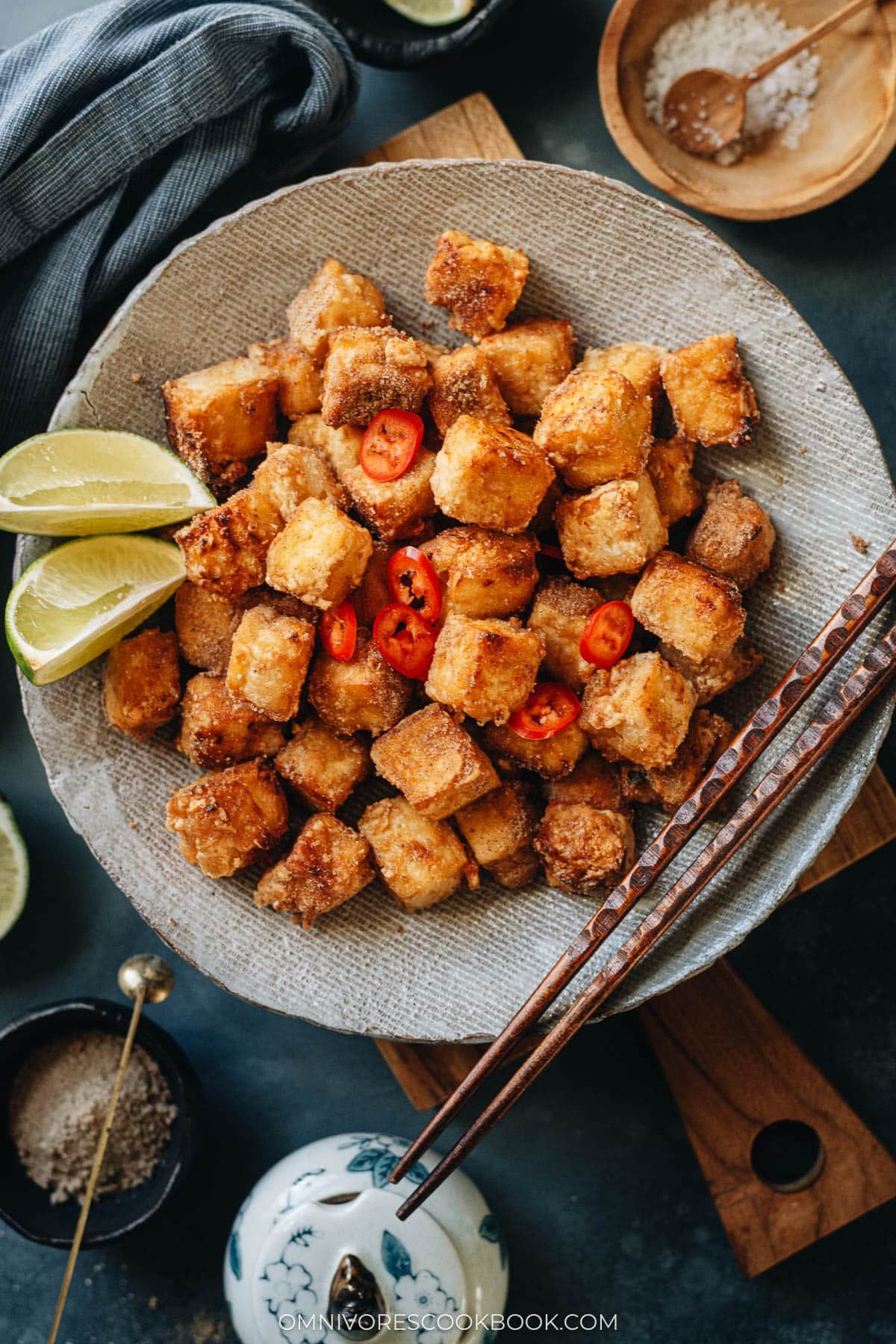 Salt and pepper tofu is a popular Chinese appetizer where cubes of tofu are fried until crunchy and tossed in a savory, slightly sweet spice blend. It is a vegan dish that works as a snack, appetizer, or side, and it is gluten free adaptable by swapping Shaoxing wine for dry sherry.