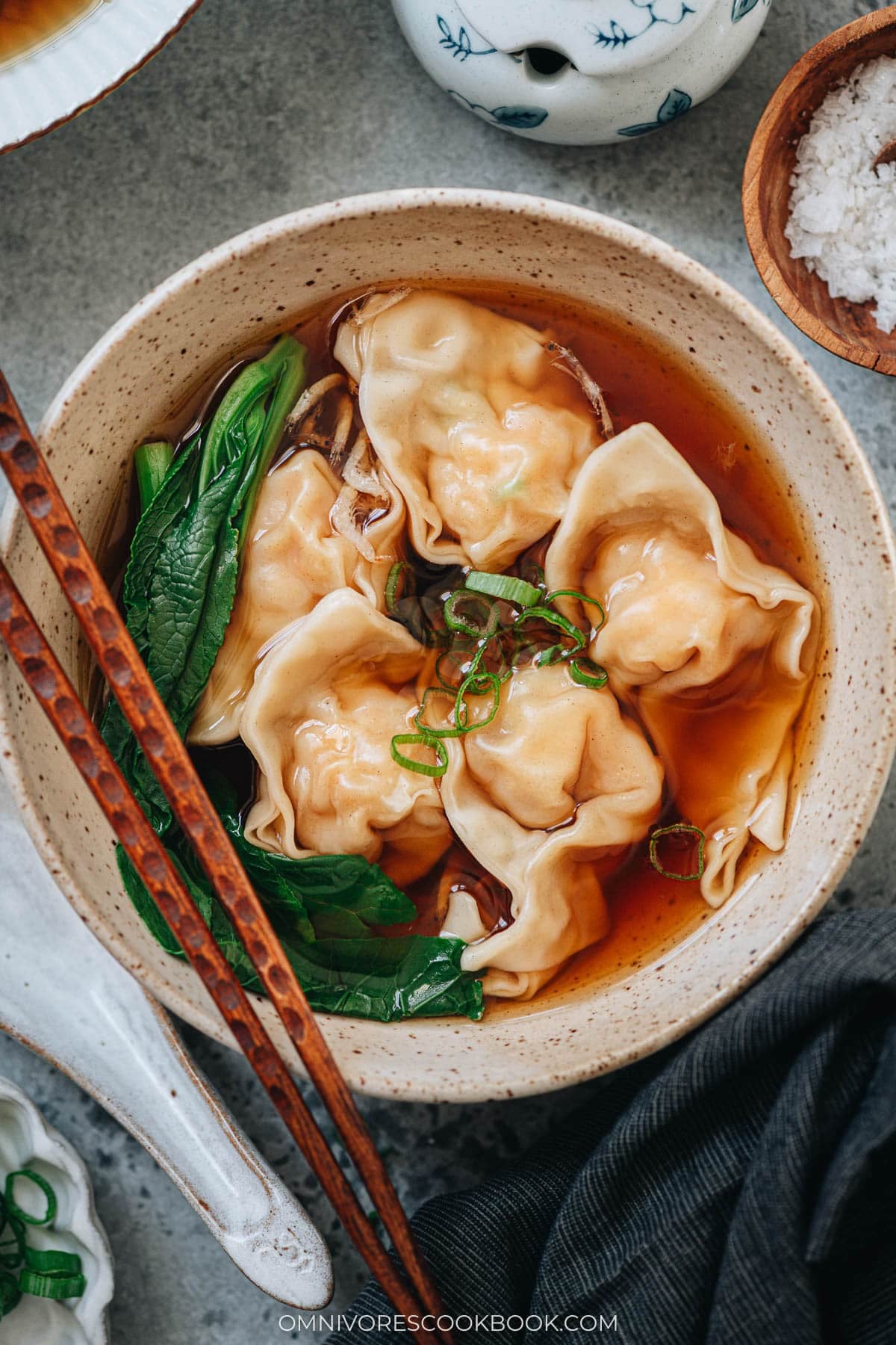 For a simple bowl of shrimp wonton soup, I don’t always add vegetables. But if I’m hosting, I like to garnish my bowl with some blanched choy sum for a pop of color.