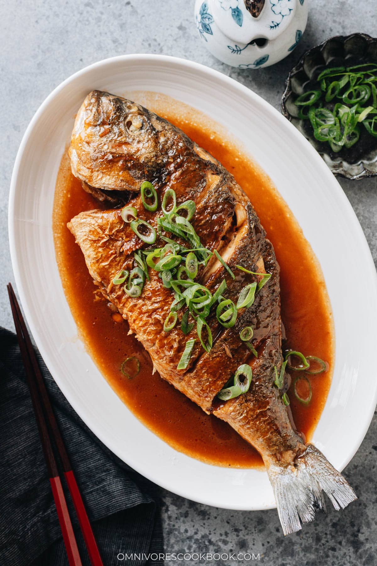 5. Reduce the sauce: Once the fish is done, the braising liquid should also be reduced. But if it’s still very runny, turn up the heat to reduce it until slightly thickened. Remember to remove the scallion and ginger pieces before serving.
