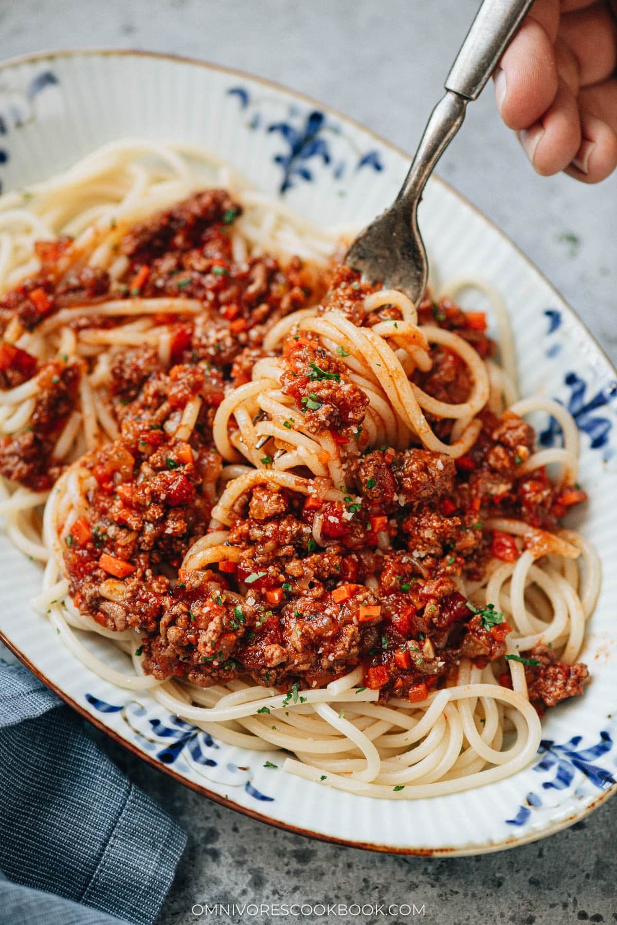 There are 2 ways I love eating this Hong Kong Bolognese Spaghetti. For an easy casual dinner at home, I ladle the sauce generously over cooked spaghetti and finish it with cheese and fresh parsley, then serve it with a veggie side like my Sichuan style eggplant salad to complete the meal.