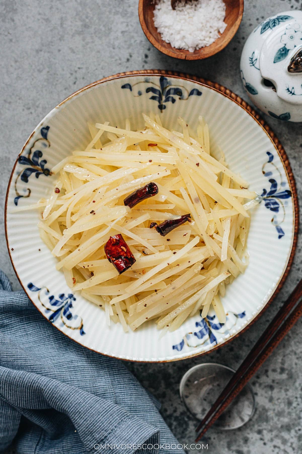 Yes. A small splash of Chinese black vinegar or rice vinegar adds brightness and is common in some regional variations. Add it after mixing the potatoes with the hot oil.