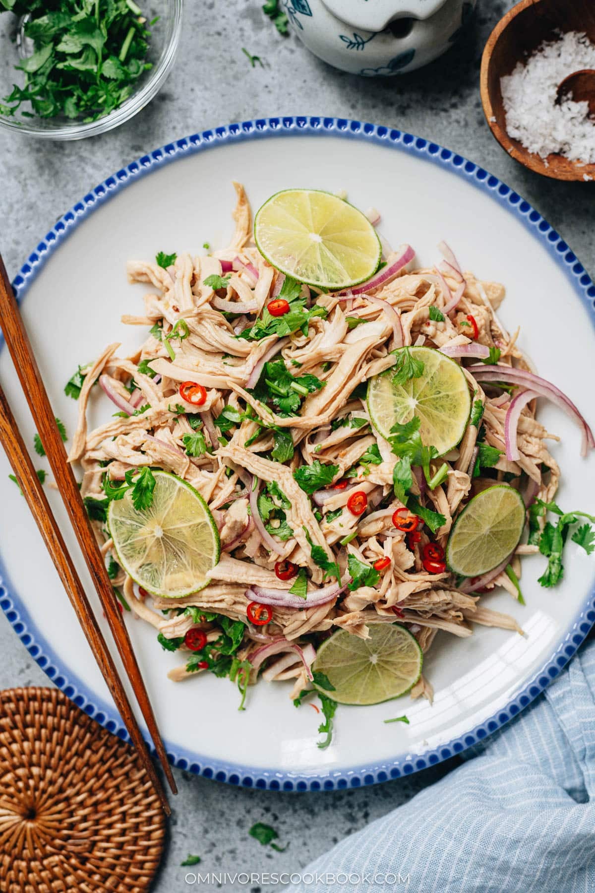- Add the garlic, purple onion, light soy sauce, Chinkiang vinegar, lime juice, sugar, Sichuan peppercorn, and pinch of salt to the chicken. Mix very well. If you have a pestle, use it to gently massage the chicken to blend the flavor in. Then add the cilantro and chili. Mix again. Taste the salad and adjust seasoning by adding more salt if needed.