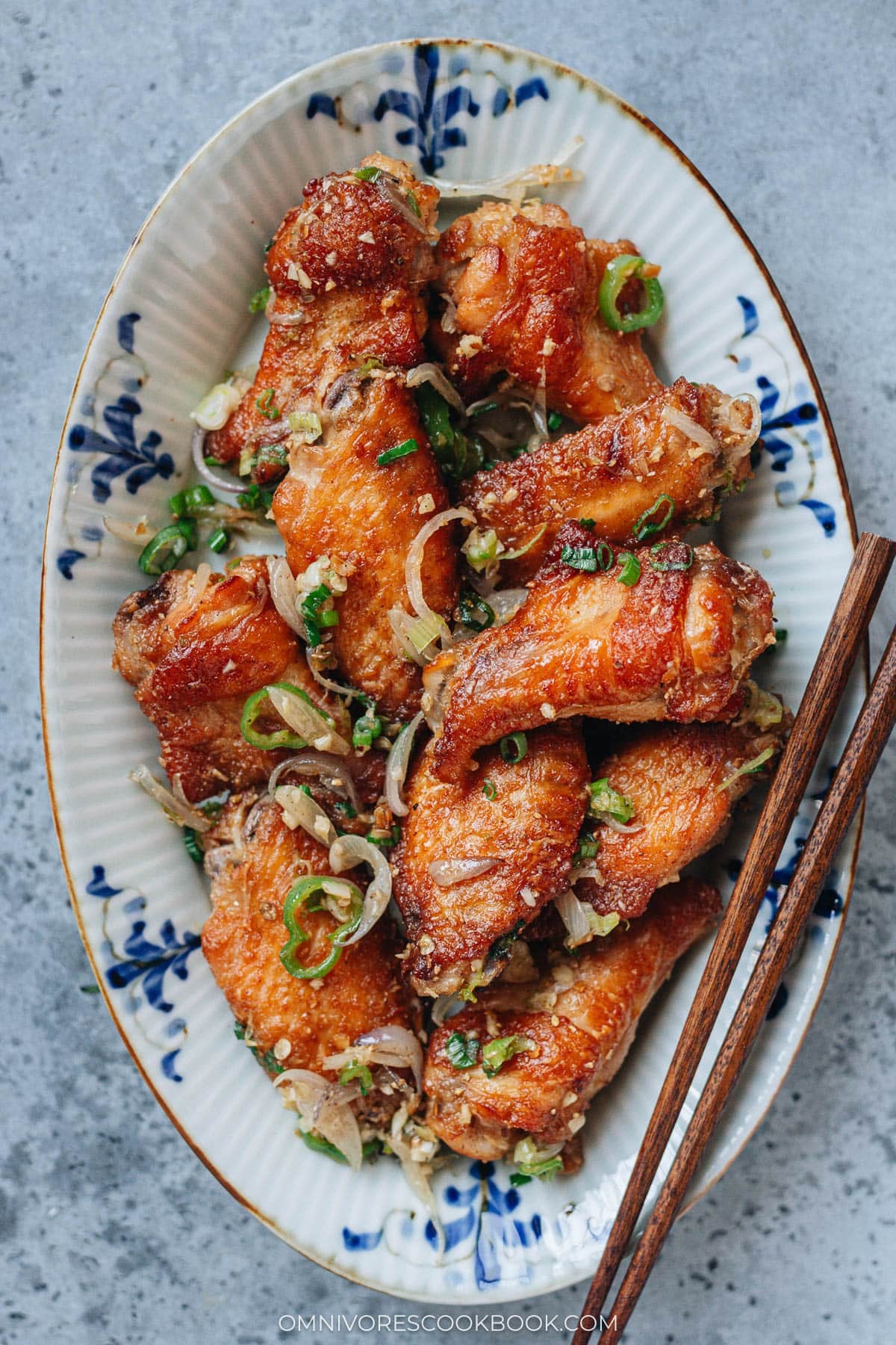 Salt and pepper chicken wings are a Chinese restaurant favorite where wings are fried until crispy and tossed with aromatics and a fragrant spice blend. My baked version skips the deep fryer and uses the oven instead, which is easier to clean up and still delivers crispy results with less oil.