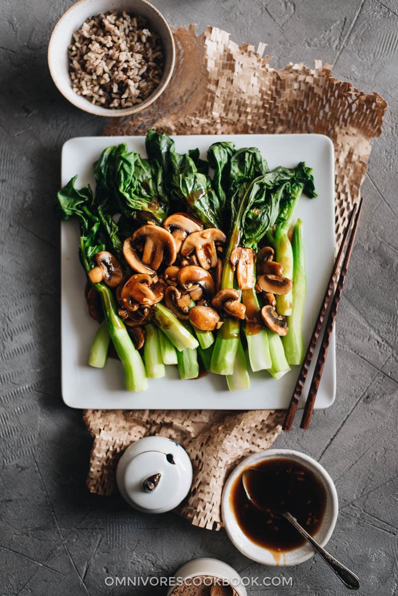 One of the easiest ways to prepare Chinese broccoli is to blanch it, then serve it with oyster sauce. You can see that recipe here. When I developed the recipe below, I used a slightly different approach – steam the Chinese broccoli in a large skillet, then use the same skillet to prepare the mushroom sauce. This method shortens the cooking time and allows you to cook everything in one pan.