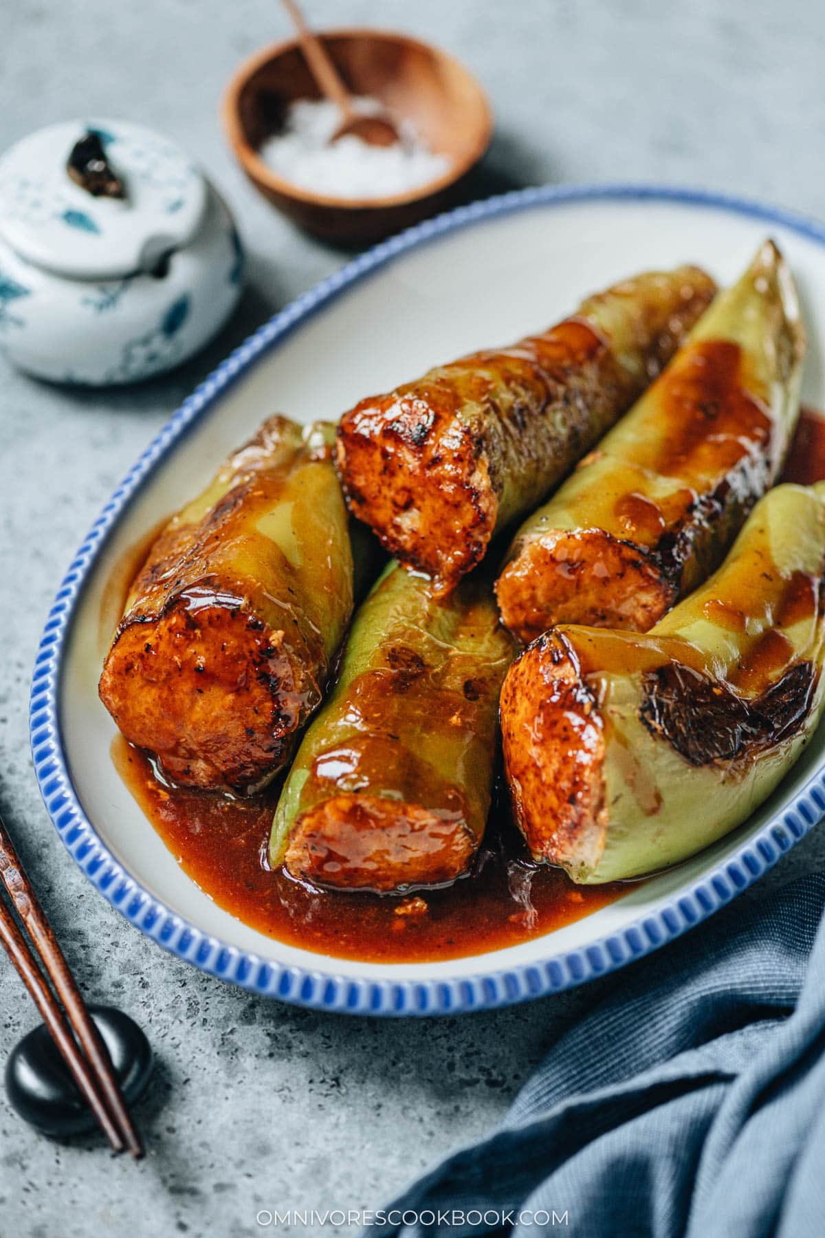 My favorite pepper for this dish is Cubanelle pepper, or Cuban pepper. It is a mild, sweet pepper with a little heat. It is not too big to cook with and yet not too small to stuff. The skin is thin, very similar to the type of pepper we use in China. Alternatively, Anaheim pepper is another great option that is quite similar to the Cuban pepper.