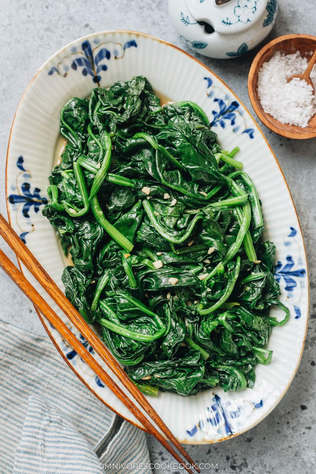 Spinach stir fry is one of those humble dishes that never goes out of style. Quick, easy, and incredibly good for you, it’s a staple in many Chinese households. It’s one of the most frequently made dishes by my mom and it’s always in our dinner rotation. She would cook such a large plate of it, but we devour the whole thing within a few minutes.