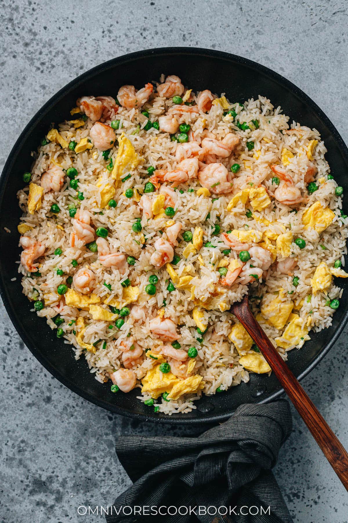 I started making this recipe because I always have leftover rice in the fridge and a bag of frozen shrimp in the freezer. Making authentic Chinese rice recipes is one of my favorite ways to repurpose leftovers, and I use the same approach for my chicken fried rice, beef fried rice, and pork fried rice. For this version, I marinate the shrimp with Shaoxing wine and cornstarch, scramble the eggs first, then toss everything together in one hot pan.