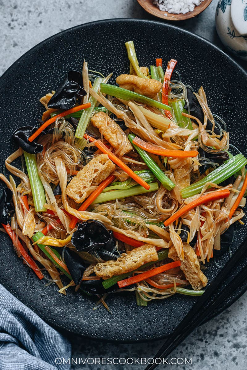 - Add the bean thread noodles, fried tofu and pour in the sauce. Cook and stir until the sauce is mostly absorbed and the vegetables just turn tender. Transfer everything to a plate and hot as a main or side dish.