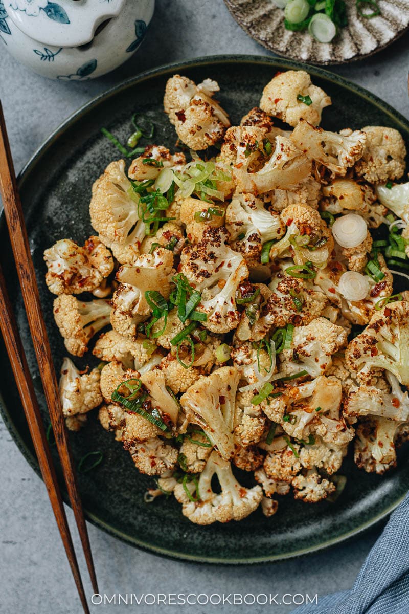 - Transfer the air fryer tray to the kitchen counter. Add the green onion and drizzle with soy sauce. Toss with a spatula. Air fry for another 2 minutes or so, until the cauliflower turns tender and the edges are browned. Serve hot as a side dish.