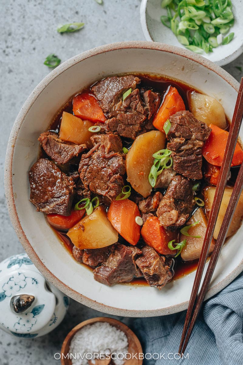 You can simply serve the beef stew as a main course by itself, or over steamed rice or boiled noodles for a one-bowl meal.